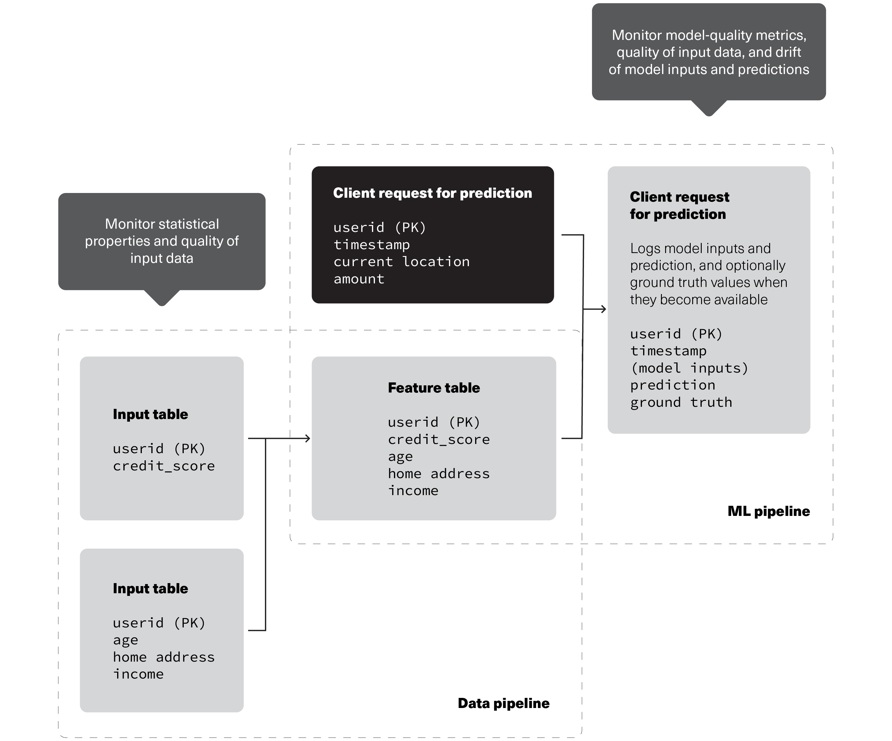 - Inference:* Similar to time series, with the addition of metrics to monitor model quality, inference tables store the output of predicted values by machine learning models, such as classification or regression. Additional columns unique to this table include: the model ID to calculate metrics on, model inputs or features, model predictions, and optional unique observation IDs, ground truth labels, and metadata for demographics.