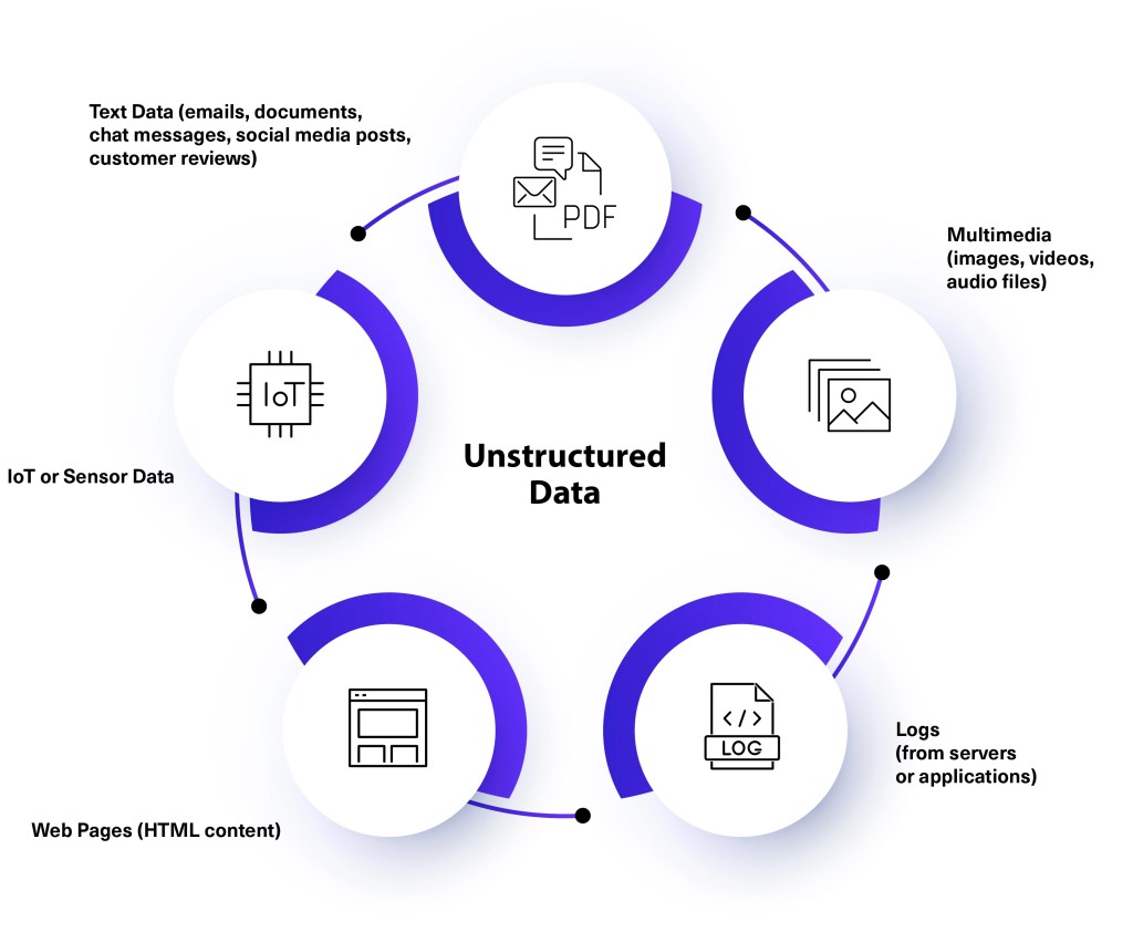 Unstructured data is any type of data without a predefined format or structure and comes in a variety of forms, such as: